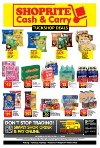 ENQUIRE IN-STORE FOR PALLET DEALS Vryburg • Ficksburg • Springs • Vosloorus • Nelspruit • Pretoria West GNFOSWDRZB/E OFFERS VALID FROM MONDAY 5 JANUARY 2026 UNTIL SUNDAY 8 FEBRUARY 2026. WHILE STOCKS LAST. WE RESERVE THE RIGHT TO LIMIT QUANTITIES. TRADERS WELCOME. VAT INCLUDED. ERRORS AND OMISSIONS EXCEPTED. CUSTOMER CARE LINE 0800 01 07 09 (TOLL-FREE). Contact your local Store on WhatsApp VRYBURG FICKSBURG SPRINGS VOSLOORUS NELSPRUIT PRETORIA WEST 078 619 0888 067 229 2431 084 759 2989 083 673 9708 083 463 2153 068 305 6341 AQUELLÉ VIV SPORTS DRINK all variants 6x500ml per pack 6 x 500ml R50 EQUIVALENT UNIT PRICE R8,33 ENERGADE SPORTS DRINK all variants 24x500ml per pack 24 x 500ml R229 EQUIVALENT UNIT PRICE R9,54 2 FOR R30 EQUIVALENT UNIT PRICE R15 NESTLÉ BAR-ONE 2x42g/ PEPPERMINT CRISP 49g/ ROLO SOFT TOFFEE 48g/ TEX 58g/SMARTIES 70g YOGUETA/ PIN POP LOLLIPOPS all variants 48 per pack 48 per pack R39 R43 R3,58/UNIT TINKIES MINI SPONGE CAKE all variants 12x30g per pack 12 x 30g per pack PARMALAT STERI STUMPIE FLAVOURED MILK all variants 6x350ml per pack 6 x 350ml R72 EQUIVALENT UNIT PRICE R12 AQUELLÉ STILL FLAVOURED DRINK all variants 6x750ml per pack 6 x 750ml R52 EQUIVALENT UNIT PRICE R8,67 FRUTIYA POWDER JUICE all variants 36x5g per pack 36 x 5g R28 EQUIVALENT UNIT PRICE R0,78 BEACON CHOCOLATE SLAB all variants 24x80g per pack 24 x 80g R382 EQUIVALENT UNIT PRICE R15,92 R52 ANY 8 FOR R6,50/UNIT LAY’S/DORITOS/ SIMBA CHIPS 8x36g/45g R312 48 per pack R6,50/UNIT LAY’S/DORITOS CHIPS all variants 48x36g/45g per pack R375 24 per pack R15,63/UNIT SIMBA POTATO CHIPS all variants 24x120g per pack HENRO SUPER CREAMS BISCUITS 12x125g per pack 12 x 125g R79 EQUIVALENT UNIT PRICE R6,58 BEACON FIZZER SWEETS all variants 24 per pack 24 per pack R45 TUCKSHOP DEALS