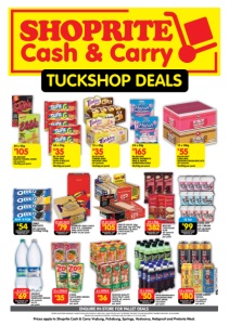 ENQUIRE IN-STORE FOR PALLET DEALS Prices apply to Shoprite Cash & Carry Vryburg, Ficksburg, Springs, Vosloorus, Nelspruit and Pretoria West. OFFERS VALID FROM MONDAY 9 MARCH 2026 UNTIL SUNDAY 5 APRIL 2026. WHILE STOCKS LAST. WE RESERVE THE RIGHT TO LIMIT QUANTITIES. TRADERS WELCOME. VAT INCLUDED. ERRORS AND OMISSIONS EXCEPTED. CUSTOMER CARE LINE 0800 01 07 09 (TOLL-FREE). GNFOSWDTSA/E R165 24 x 50g R6,88/UNIT MAGIC MOMENTS PINK & WHITE MARSHMALLOWS 24x50g per pack R105 24 x 45g R4,38/UNIT ELDO’S POTATO CHIPS all variants 24x45g per pack R55 12 x 100g R4,58/UNIT CASA-MIA DODGER CREAM BISCUITS all variants 12x100g per pack CADBURY MINI LUNCH BAR/ P.S. CARAMILK MINI CHOCOLATE BARS 24 per pack 24 per pack R79 EQUIVALENT UNIT PRICE R3,29 BEACON CHOCOLATE SLAB all variants 24x80g per pack 24 x 80g R382 EQUIVALENT UNIT PRICE R15,92 COOL JOY ICE CREAM all variants 12x125ml 12 for R99 EQUIVALENT UNIT PRICE R8,25 AQUELLÉ FLAVOURED SPARKLING DRINKS all variants 6x1,5l per pack 6 x 1,5l R69 EQUIVALENT UNIT PRICE R11,50 PEPSI/REFRESHHH/ MOUNTAIN DEW SOFT DRINK 12x330ml per pack 12 x 330ml R50 EQUIVALENT UNIT PRICE R4,17 RHODES QUALITY 100% FRUIT JUICE BLEND all variants 6x200ml per pack 6 x 200ml R36 ZOOM FLAVOURED DRINKS all variants 12x200ml per pack 12 x 200ml R35 SCORE ENERGY DRINKS all variants 24x500ml per pack 24 x 500ml R180 EQUIVALENT UNIT PRICE R7,50 R35 48 x 22g R0,73/UNIT CASA-MIA SUPA G BISCUIT all variants 48x22g per pack R35 12 x 30g R2,92/UNIT TINKIES MINI SPONGE CAKE all variants 12x30g per pack NESTLÉ KITKAT 20g/ BAR-ONE 21g/TEX 18g/ SMARTIES 17g MILK CHOCOLATE 24 per pack 24 per pack R105 EQUIVALENT UNIT PRICE R4,38 OREO BISCUITS all variants 4x128g/133g ANY 4 FOR R54 EQUIVALENT UNIT PRICE R13,50 TUCKSHOP DEALS