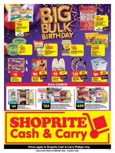 OFFERS VALID FROM MONDAY 23 FEBRUARY 2026 UNTIL SUNDAY 8 MARCH 2026. WHILE STOCKS LAST. WE RESERVE THE RIGHT TO LIMIT QUANTITIES. TRADERS WELCOME. VAT INCLUDED. ERRORS AND OMISSIONS EXCEPTED. CUSTOMER CARE LINE 0800 01 07 09 (TOLL-FREE). Prices apply to Shoprite Cash & Carry Philippi only. Page 4 Contact your local Store on Whatsapp PHILIPPI 072 430 9172 073 484 7234 078 923 1751 SIGN UP TO OUR XTRA SAVINGS CLUB AND GET INSTANT CASH SAVINGS Simply dial *134*569* CARDNUMBER# for FREE to get started WhatsApp: 087 240 5709 Open an account in-store, or: Money Market Account is a division of Shoprite Checkers (Pty) Ltd (FSP7732). Ts&Cs apply. FREE DELIVERY within 50kms* ORDER via WhatsApp PAY from your phone leaving your store! Restock without WCFOSWDTME/E ZEBRA ALUMINIUM CASSEROLE POT 8l each R119 FLOOR BROOM CARLA all variants each R39 ZEBRA POT SET 13l & 21l per set R299 ESSENTIALS MICROWAVE OVEN 20l each R699 ESSENTIALS TWIN SPIRAL COMPACT HOTPLATE 2000W each R159 WHITE COTTON STRING MOP 280g each R49 ESSENTIALS JUG BLENDER 1,5l 400W each R199 ENGEN PREMIUM 40 MOTOR OIL 500ml each R25 ESSENTIALS GLASS KETTLE CORDLESS 1,7l each R199 BUDGET BUCKET/BASIN all variants each R16 ENGEN MULTIGRADE 20W-50 PREMIUM MOTOR OIL 5l each R249 2000W COLGATE DOUBLE ACTION TOOTHBRUSH 12 per pack 12 per pack R95 EQUIVALENT UNIT PRICE R7,92 VASELINE PETROLEUM JELLY SKIN PROTECTANT 48x7g per pack 48 x 7g R229 EQUIVALENT UNIT PRICE R4,77 VITALLI EVERYDAY SANITARY PADS 48x8 per pack 48 x 8s R278 EQUIVALENT UNIT PRICE R5,79 ALBEX BLEACH all variants 4x5l per pack 4 x 5l R244 EQUIVALENT UNIT PRICE R61 DARK AND LOVELY NO LYE RELAXER KIT per pack per pack R89 DOOM INSECTICIDE all variants 6x300ml per pack 6 x 300ml R209 EQUIVALENT UNIT PRICE R34,83 POLAGRIC DISHWASHING LIQUID 5x750ml per pack 5 x 750ml R69 EQUIVALENT UNIT PRICE R13,80 MAQ MULTIPURPOSE CREAM CLEANER all variants 5x750ml per pack 5 x 750ml R9250 EQUIVALENT UNIT PRICE R18,50 SUNLIGHT LAUNDRY SOAP BAR 42x500g per pack 42 x 500g R869 EQUIVALENT UNIT PRICE R20,69 MAQ REGULAR WASHING POWDER 12x1kg per pack 12 x 1kg R379 EQUIVALENT UNIT PRICE R31,58 NIVEA ROLL-ON FOR LADIES/MEN all variants 6x50ml per pack 6 x 50ml R147 EQUIVALENT UNIT PRICE R24,50 STA-SOFT FABRIC CONDITIONER REFILL all variants 18x500ml per pack 18 x 500ml R445 EQUIVALENT UNIT PRICE R24,72 DETTOL BATH SOAP all variants 12x175g per pack 12 x 175g R149 EQUIVALENT UNIT PRICE R12,42 SAVE R12,40 WITH CARD PURITY BABY FOOD all variants 6x125ml per pack R7750 6 x 125ml R12,92/UNIT SAVE R14,90 WITH CARD NESTLÉ CERELAC BABY CEREAL WITH MILK all variants 6x200g/250g per pack R195 6 x 200g/250g R32,50/UNIT SAVE R40,99 WITH CARD HUGGIES DRY COMFORT JUMBO PACK NAPPIES 52/56/60/74/84 per pack R159 per pack SAVE R40,99 WITH CARD HUGGIES GOLD VALUE PACK NAPPIES 42/50/58/66/PANTS 35/40/46/52 per pack R159 per pack REITZER’S AQUEOUS CREAM 500ml each 1 x 500ml R25 COLGATE ORIGINAL/GEL/ HERBAL TOOTHPASTE 12x100ml per pack 12 x 100ml R205 EQUIVALENT UNIT PRICE R17,08 SECUREX BATH SOAP all variants 4x175g per pack 4 x 175g R36 EQUIVALENT UNIT PRICE R9 SAVE R5,99 WITH CARD CLERE PETROLEUM JELLY all variants 250ml each R29 1 x 250ml + DOMESTOS MULTIPURPOSE THICK BLEACH all variants 2x750ml 2 FOR R53 EQUIVALENT UNIT PRICE R26,50 DOOM SUPER DEADLY MOSQUITO COILS 5x125g per pack 5 x 125g R65 EQUIVALENT UNIT PRICE R13 BABY SOFT FRESH WHITE 2-PLY TOILET ROLLS 18 per pack 18 per pack R119