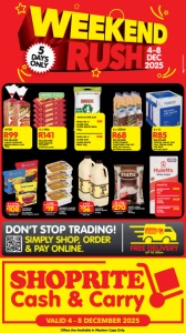 Contact your local Store on WhatsApp SIGN UP TO OUR XTRA SAVINGS CLUB AND GET INSTANT CASH SAVINGS Simply dial *134*569* CARDNUMBER# for FREE to get started VALID 4 - 8 DECEMBER 2025 Offers Are Available in Western Cape Only. STA-SOFT FABRIC SOFTENER REFILL all variants 18x500ml per pack 18 x 500ml R422 EQUIVALENT UNIT PRICE R23,44 WCFOSWDRKU Open an account in-store, or: Money Market Account is a division of Shoprite Checkers (Pty) Ltd (FSP7732). Ts&Cs apply. ORDER via WhatsApp PAY from your phone leaving your store! Restock without FREE DELIVERY within 50kms* WhatsApp: 087 240 5709 ALBEX BLEACH all variants 12x750ml per pack 12 x 750ml R119 EQUIVALENT UNIT PRICE R9,91 DOOM INSECTICIDE all variants 6x180ml per pack 6 x 180ml R129 EQUIVALENT UNIT PRICE R21,50 PLUSH PLUSH SHOE POLISH all variants 12x50ml per pack R109 R99 PLUSH SHOE POLISH all variants 6x100ml per pack DAILY LAUNDRY SOAP 10x500g 10 FOR R96 EQUIVALENT UNIT PRICE R9,60 R129 R10,75/UNIT 12 x 175g PROTEX BATH SOAP all variants 12x175g per pack R229 R4,77/UNIT 48 per pack VASELINE SKIN PROTECTANT PETROLEUM JELLY 48x7g per pack PLUSH SUPREME PINE GEL all variants 12x1l per pack 12 x 1l R259 EQUIVALENT UNIT PRICE R21,58 SPRING SOFT 1-PLY TOILET ROLLS 24 per pack 24 per pack R66 EQUIVALENT UNIT PRICE R2,75 POLAGRIC LEMON DISHWASHING LIQUID 5x750ml 5 x 750ml R65 EQUIVALENT UNIT PRICE R13 VITALLI EVERYDAY SANITARY PADS 10x8 per pack 10 FOR R49 EQUIVALENT UNIT PRICE R4,90 COLGATE COLGATE GEL/ORIGINAL/HERBAL WHITE TOOTHPASTE 12x100ml per pack R199 R149 COLGATE TOOTHPASTE TRIPLE ACTION 12x100ml per pack R89 R7,42/UNIT 12 FOR COLGATE DOUBLE ACTION MEDIUM TOOTHBRUSH 12 per pack VRYBURG FICKSBURG SPRINGS VOSLOORUS NELSPRUIT PRETORIA WEST 078 619 0888 067 229 2431 084 759 2989 083 673 9708 083 463 2153 068 305 6341