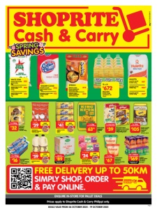 OFFERS VALID FROM MONDAY 06 OCTOBER 2025 UNTIL SUNDAY 19 OCTOBER 2025. WHILE STOCKS LAST. WE RESERVE THE RIGHT TO LIMIT QUANTITIES. TRADERS WELCOME. VAT INCLUDED. ERRORS AND OMISSIONS EXCEPTED. CUSTOMER CARE LINE 0800 01 07 09 (TOLL-FREE). Page 4 Prices apply to Shoprite Cash & Carry Philippi only. WCFOSWDQBM/E SAVE WITH CARD SONA BATH SOAP all variants 10x300g R95 10 x 300g R9,50/UNIT Contact your local Store on Whatsapp PHILIPPI 072 430 9172 073 484 7234 078 923 1751 SIGN UP TO OUR XTRA SAVINGS CLUB AND GET INSTANT CASH SAVINGS Simply dial *134*569* CARDNUMBER# for FREE to get started WhatsApp: 087 240 5709 Open an account in-store, or: Money Market Account is a division of Shoprite Checkers (Pty) Ltd (FSP7732). Ts&Cs apply. FREE DELIVERY within 50kms* ORDER via WhatsApp PAY from your phone leaving your store! Restock without FLOOR BROOM all variants each R34 WHITE COTTON STRING MOP each R34 PLUSH SUPREME PINE GEL ALL PURPOSE CLEANER all variants 1l each 1 x 1l R26 SAVE WITH CARD BRITE LITE LAUNDRY SOAP 2x1kg R40 2 x 1kg R20/UNIT DOOM SUPER MULTI INSECT INSECTICIDE 6x180ml 6 x 180ml R130 EQUIVALENT UNIT PRICE R21,67 POLAGRIC DISHWASHING LIQUID 24x400ml per pack 24 x 400ml R216 EQUIVALENT UNIT PRICE R9 ESSENTIALS BLUE NONSTICK STEAM IRON 1600W each R129 ESSENTIALS AUTO KETTLE BLACK/WHITE 1,7l each R129 ENGEN PREMIUM 40 MOTOR OIL 500ml each R29 ENGEN MULTIGRADE MOTOR OIL 20W-50 5l each R239 BUDGET BASIN 32cm/BUDGET BUCKET 9l all variants each R17 SAVE WITH CARD VITALLI SANITARY PADS 10x8 per pack R59 10 x 8s R5,90/UNIT SAVE WITH CARD MAQ REGULAR HAND WASHING POWDER 2x500g R42 2 x 500g R21/UNIT COLGATE DOUBLE ACTION MEDIUM TOOTHBRUSH 12 per pack 12 per pack R92 EQUIVALENT UNIT PRICE R7,67 PROTEX BATH SOAP all variants 12x175g per pack 12 x 175g 13999 EQUIVALENT UNIT PRICE R11,66 COLGATE MAXIMUM CAVITY PROTECTION GEL FLUORIDE TOOTHPASTE 12x100ml 12 x 100ml R217 EQUIVALENT UNIT PRICE R18,08 SHIELD ROLL-ON FOR LADIES/MEN all variants 6x50ml R118 EQUIVALENT UNIT PRICE R19,67 6 x 50ml HUGGIES DRY COMFORT SIZE 5 DISPOSABLE NAPPIES per pack per pack R135 ESSENTIALS JUG BLENDER 1,5l 400W each R249 ZEBRA POT SET 13l/21l per set R299 NESTLÉ CERELAC BABY CEREAL all variants 6x200g/250g per pack 6 x 200g/250g R195 EQUIVALENT UNIT PRICE R32,50 PURITY BABY FOOD all variants 6x125ml per pack 6 x 125ml R72 EQUIVALENT UNIT PRICE R12 ZEBRA CASSEROLE SET 6 PIECE per set R249 LOVIES SCENTED/ UNSCENTED BABY WIPES 4x56 per pack 4 x 56s R69 SAVE WITH CARD ALBEX BLEACH all variants 750ml R23 2 FOR R11,50/UNIT