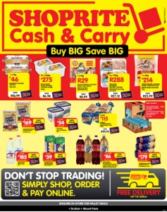 Open an account in-store, or: Money Market Account is a division of Shoprite Checkers (Pty) Ltd (FSP7732). Ts&Cs apply. ORDER via WhatsApp PAY from your phone leaving your store! Restock without FREE DELIVERY within 50kms* WhatsApp: 087 240 5709 Contact your local Store on WhatsApp DURBAN MOUNT FRERE 064 382 0819 064 383 8773 SIGN UP TO OUR XTRA SAVINGS CLUB AND GET INSTANT CASH SAVINGS Simply dial *134*569* CARDNUMBER# for FREE to get started SUNLIGHT PINE GEL 500ml each 1 x 500ml R20 DOOM MOSQUITO COILS 5x125g per pack 5 x 125g R53 EQUIVALENT UNIT PRICE R10,60 BRITE LITE LAUNDRY SOAP 10x500g 10 FOR R89 EQUIVALENT UNIT PRICE R8,90 COLGATE DOUBLE ACTION TOOTHBRUSH 12 per pack 12 per pack R92 EQUIVALENT UNIT PRICE R7,67 10 FOR R59 EQUIVALENT UNIT PRICE R5,90 VITALLI EVERYDAY SANITARY PADS 8 per pack each 1650 KOTEX PANTYLINERS all variants 16/18/20 per pack BODY SOLUTIONS SHAMPOO & CONDITIONER/BODY WASH CONCENTRATE 24x50ml per pack 24 x 50ml R115 EQUIVALENT UNIT PRICE R4,79 PROTEX BATH SOAP all variants 12x175g per pack 12 x 175g R139 EQUIVALENT UNIT PRICE R11,58 CLERE BODY CRÈME all variants 450ml/500ml each 1 x 450ml/500ml R32 MR. MIN FURNITURE POLISH all variants 300ml each 1 x 300ml 2750 4 x 175g R36 EQUIVALENT UNIT PRICE R9 SECUREX BATH SOAP all variants 175g NIVEA ROLL-ON FOR LADIES/MEN all variants 6x50ml per pack 6 x 50ml R149 EQUIVALENT UNIT PRICE R24,83 COLGATE TRIPLE ACTION TOOTHPASTE 12x100ml per pack 12 x 100ml R159 EQUIVALENT UNIT PRICE R13,25 DARK AND LOVELY PRECISE DIAMOND REGULAR/SUPER STRAIGHT & SHINE RELAXER CREAM R4250 DARK AND LOVELY SUPERIOR MOISTURE PLUS REGULAR/ SUPER NO LYE RELAXER KITT R8750 DARK AND LOVELY RHINO SHOE POLISH all variants 50ml each 1 x 50ml R12 5 FOR R99 EQUIVALENT UNIT PRICE R19,80 NEWDEN PETROLEUM JELLY all variants 200g MORTEIN INSECTICIDE all variants 12x300ml per pack 12 x 300ml R415 EQUIVALENT UNIT PRICE R34,58 NEWDEN WHITE QUALITY CANDLES 450g 2 FOR R39 EQUIVALENT UNIT PRICE R19,50 ALBEX BLEACH all variants 4x5l per pack 4 x 5l R244 EQUIVALENT UNIT PRICE R61 POLAGRIC LEMON DISHWASHING LIQUID 20x750ml per pack 20 x 750ml R273 EQUIVALENT UNIT PRICE R13,65 STA-SOFT FABRIC SOFTENER all variants 9x2l per pack 9 x 2l R439 EQUIVALENT UNIT PRICE R48,77 SURF HANDWASH POWDER 2kg 1 x 2kg R50 MADUBULA DISINFECTANT 5x100ml per pack 5 x 100ml R43 EQUIVALENT UNIT PRICE R8,60 Prices apply to Shoprite Cash & Carry Durban, Mount Frere only. OFFERS VALID FROM MONDAY 20 OCTOBER 2025 UNTIL SUNDAY 2 NOVEMBER 2025. WHILE STOCKS LAST. WE RESERVE THE RIGHT TO LIMIT QUANTITIES. TRADERS WELCOME. VAT INCLUDED. ERRORS AND OMISSIONS EXCEPTED. CUSTOMER CARE LINE 0800 01 07 09 (TOLL-FREE). Page 4 ZNFOSWDQGJ/E PURITY 2ND FOOD 200g/CREAM OF MAIZE all variants 400g R40 ANY 2 FOR R20/UNIT SAVE R6,98 WITH CARD DRYNAPS UNSCENTED BABY WIPES 80 per pack R29 2 FOR R14,50/UNIT SAVE R24,99 WITH CARD HUGGIES DRY COMFORT VALUE PACK DISPOSABLE NAPPIES 42/44/46/52/58 per pack R135 per pack SAVE R1,98 WITH CARD PURITY BABY FOOD POUCH all variants 100g R19 2 FOR R9,50/UNIT SAVE R23,17 WITH CARD NESTLÉ NESTUM BABY CEREAL all variants 6x200g per pack R139 6 x 200g