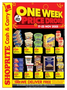 Cash & Carry ALL CUSTOMERS ARE WELCOME TO SHOP HERE - OPEN TO THE PUBLIC Minimum order quantities apply. Ask in-store for more information. WITHIN A 50km RADIUS WE DELIVER FREE 7 DAYS ONLY 17-23 NOV 2025 R29 2 FOR R14,50/UNIT OLÉ BREAD SPREAD 25% FAT SPREAD 500g R59 2 FOR R29,50/UNIT D’LITE 37% FAT SPREAD 1kg R44 48 per pack ALPEN NUTRIFIC WHOLEWHEAT BISCUITS 48 per pack R99 24 x 45g R4,13/UNIT ELDO’S POTATO CHIPS all variants 24x45g per pack R92 1 x 10kg GOLDEN PEARL MEDIUM GRAIN PARBOILED WHITE RICE 10kg R99 1 x 144s IMANA BEEF/CHILLI BEEF STOCK CUBES 144 per pack R70 2 FOR R35/UNIT NOLA ORIGINAL MAYONNAISE JAR 750g R50 2 FOR R25/UNIT MAMA’S APRICOT/ MIXED FRUITJAM 900g + + + R20 1 x 100 per pack TEA TIME TEA BLEND TEABAGS 100 per pack + R120 8 FOR R15/UNIT ALBANY SUPERIOR SLICED WHITE BREAD 700g Prices apply to Shoprite Cash & Carry Durban. ZNFOSWDQSI/E