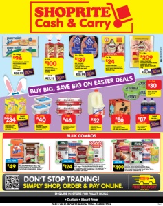 BUY BIG, SAVE BIG ON EASTER DEALS UP TO 50km DON’T STOP TRADING! SIMPLY SHOP, ORDER & PAY ONLINE. BULK COMBOS Page 1 • Durban • Mount Frere ENQUIRE IN-STORE FOR PALLET DEALS DEALS VALID FROM 23 MARCH 2026 - 5 APRIL 2026 R94 1 x 900g PARMALAT FULL CREAM PROCESSED CHEESE SLICES all variants 900g each SAVE R30,99 R209 1 x 5kg GOLDI CHICKEN FROZEN CHICKEN MIXED PORTIONS WITH BRINE-BASED MIXTURE 5kg SAVE R20,99 R24 1 x 1kg GOLDI CHICKEN FROZEN CHICKEN SOUP PACK WITH BRINE-BASED MIXTURE 1kg R139 10 x 500g R13,90/UNIT RICA FROZEN UBUNTU BRAAI WORS 10x500g per pack SAVE R20,99 RAINBOW FROZEN CHICKEN LIVERS 4x250g per pack R40 4 x 250g R10/UNIT ZNFOSWDTMT/E SAVE R17,24 PEPSI REGULAR SOFT DRINK 6x2l per pack R87 6 x 2l R14,50/UNIT SAVE R55,10 DANONE ULTRA MEL VANILLA CUSTARD 10x1kg per pack R234 10 x 1kg R23,40/UNIT + + JUMBO’S WHITE SUGAR 10kg + GOLDEN PENNY PARBOILED RICE 10kg + ITAU SUPABAKE CAKE WHEAT FLOUR 10kg + ITAU SUPER WHITE SUPER MAIZE MEAL 10kg + D’LITE PURE COOKING OIL 2l ALL FOR R499 10kg 10kg 10kg 10kg 2l + + GOLDEN PENNY LONG GRAIN PARBOILED WHITE RICE 2kg + ITAU SUPER WHITE SUPER MAIZE MEAL 2,5kg + SASKO CAKE WHEAT FLOUR 2,5kg + JUMBO’S WHITE SUGAR 2kg + D’LITE PURE COOKING OIL 500ml ALL FOR R124 2kg 2,5kg 500ml 2kg + + + + 2,5kg NYALA SUPER MAIZE MEAL 1kg + TASTIC PARBOILED WHITE RICE 1kg + D’LITE PURE COOKING OIL 500ml ALL FOR R49 1kg 1kg 500ml + + R100 8 FOR R12,50/UNIT ALBANY SUPERIOR BROWN BREAD 8x700g SAVE R27,92 ISIBHAKELA ORANGE GROVE MAAS 4l R52 1 x 4l FIRST CHOICE FULL CREAM LONG LIFE MILK 6x1l per pack R86 6 x 1l R14,33/UNIT RAINBOW FRENCH/ CHICKEN POLONY 1kg each R46 1 FOR D’LITE 37% FAT SPREAD 1kg each R30 1 x 1kg