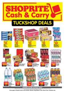 ENQUIRE IN-STORE FOR PALLET DEALS Prices apply to Shoprite Cash & Carry Durban, Idutywa, King William’s Town, Mount Frere, Thembani only. OFFERS VALID FROM MONDAY 9 MARCH 2026 UNTIL SUNDAY 5 APRIL 2026. WHILE STOCKS LAST. WE RESERVE THE RIGHT TO LIMIT QUANTITIES. TRADERS WELCOME. VAT INCLUDED. ERRORS AND OMISSIONS EXCEPTED. CUSTOMER CARE LINE 0800 01 07 09 (TOLL-FREE). ECFOSWDTSY/E R165 24 x 50g R6,88/UNIT MAGIC MOMENTS PINK & WHITE MARSHMALLOWS 24x50g per pack R55 12 x 100g R4,58/UNIT CASA-MIA DODGER CREAM BISCUITS all variants 12x100g per pack CADBURY MINI LUNCH BAR/P.S. CARAMILK MINI CHOCOLATE BARS 24 per pack 24 per pack R79 EQUIVALENT UNIT PRICE R3,29 ELDO’S POTATO CHIPS all variants 24x45g per pack 24 x 45g R105 EQUIVALENT UNIT PRICE R4,38 BEACON CHOCOLATE SLAB all variants 10x80g per pack 10 FOR R159 EQUIVALENT UNIT PRICE R15,90 MILKIT FLAVOURED MILKSHAKE all variants 6x250ml per pack 6 x 250ml R55 EQUIVALENT UNIT PRICE R9,17 AQUELLÉ STILL FLAVOURED DRINK all variants 6x750ml per pack 6 x 750ml R52 EQUIVALENT UNIT PRICE R8,67 AQUELLÉ FLAVOURED SPARKLING DRINKS all variants 6x1,5l per pack 6 x 1,5l R69 EQUIVALENT UNIT PRICE R11,50 COOL JOY ICE CREAM all variants 12x125ml ANY 12 FOR R99 EQUIVALENT UNIT PRICE R8,25 RHODES QUALITY 100% FRUIT JUICE BLEND all variants 6x200ml per pack 6 x 200ml R36 SCORE ENERGY DRINKS all variants 24x500ml per pack 24 x 500ml R180 EQUIVALENT UNIT PRICE R7,50 R35 48 x 22g R0,73/UNIT CASA-MIA SUPA G BISCUIT all variants 48x22g per pack R43 12 x 30g R3,58/UNIT TINKIES MINI SPONGE CAKE all variants 12x30g per pack NESTLE KITKAT 2 FINGER 20G/BAR-ONE 21G/TEX 18G/SMARTIES 17G MINI MILK CHOCOLATE 24 per pack 24 per pack R105 EQUIVALENT UNIT PRICE R4,38 R54 ANY 4 FOR R13,50/UNIT OREO BISCUITS all variants 4x128g/133g TUCKSHOP DEALS